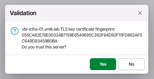 To connect to the Veeam Infrastructure Appliance, we do not need any credentials. It works for the first backup server, connecting to the new appliance. The only thing we need is to verify the certificate fingerprint: