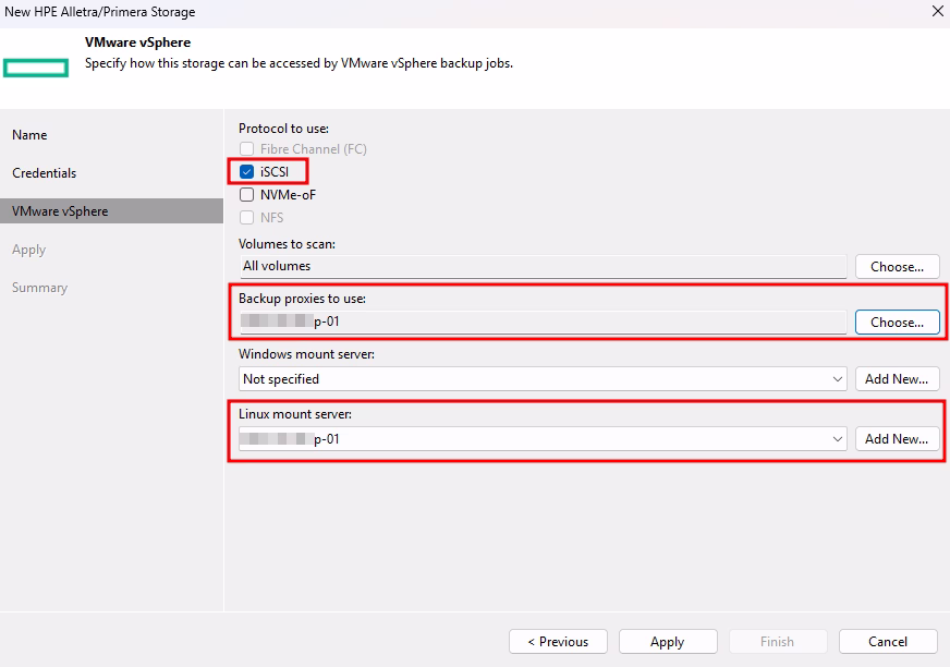 In the next window, select a desired protocol (in my case:  iSCSI). You can also select a specify proxy and a mount server:
